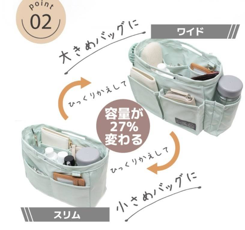 バッグの大きさに合わせて収納量が変えられて、使い方が広がるリバーシブル